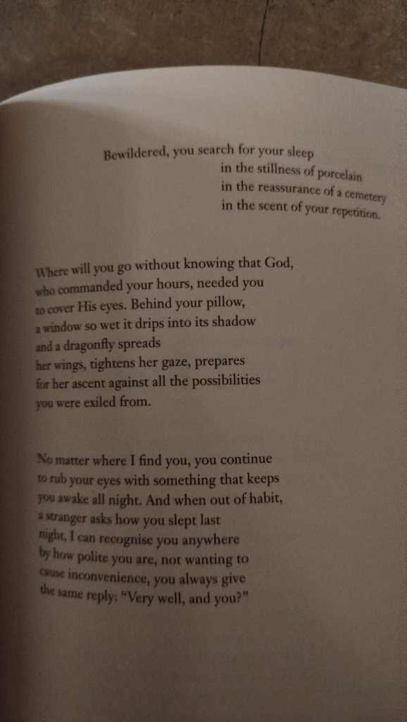 During my dysregulation, I couldn’t sleep for 3 days and 3 nights, until a package arrived in the mail from Aotearoa. It contained a poetry journal I had just been featured in. I opened each copy to whatever page it would fall onto, and read stanzas from it. One poem by Shivangi Mariam Raj, whose words I only knew through her critical essays, had a line about God needing us to close His eyes, and that finally put me to sleep.