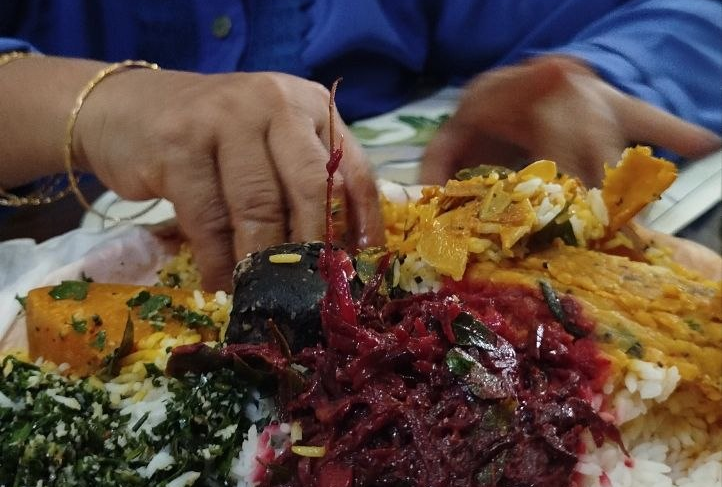 When I awoke, my mother had asked the neighbour who makes lunch parcels to provide us lunch, and my mother offered to feed me. It had all the curries I cook myself: pumpkin, beetroot, paruppu.