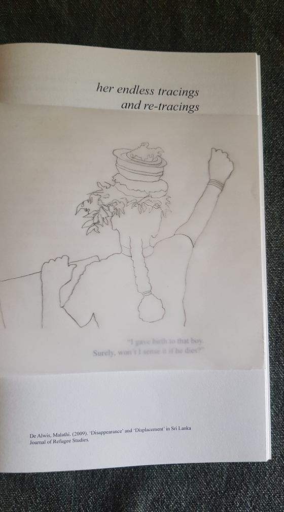 The project “Testimony of The Disappeared” includes a chapbook, tracings, and posters that together operate as a vessel where grief and grievances, the trial of waiting, obliterated bodies of experience and information such as witness reports, official mandates, journal entries, and communal testimony coalesce to confront the limits of state law – its codes of erasure, denial, and amnesia. In wrestling with enforced disappearances, missing persons, and abductions, especially in the Northern Province during the civil war years in Sri Lanka, poethical modes claim space by accentuating slippages, repetitions, and redaction. While a singular language toward restorative justice faces obstacles on many fronts, as an artistic pursuit, our attention is held by the affective and volatile journeys of individuals resolute and in unresolved mourning – that which both claims and defies ink.